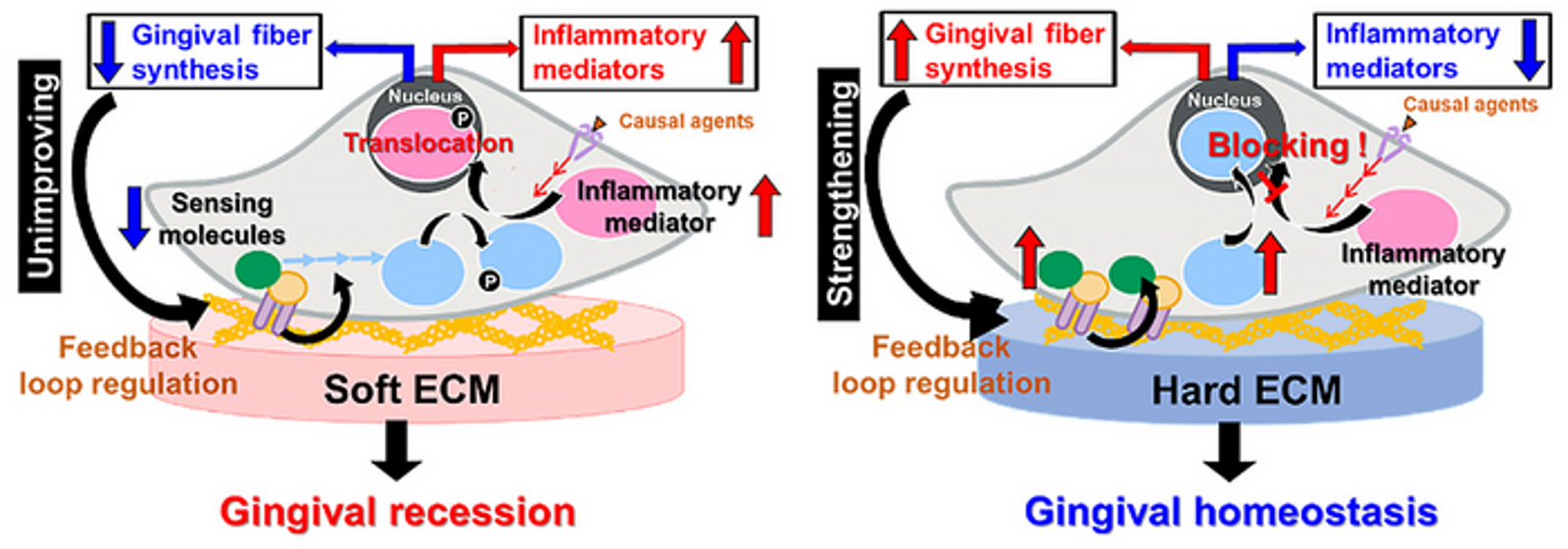 Dr Yamada, along with his colleague Prof. Hiroshi Egusa, also from the Tohoku University's Graduate School of Dentistry, created an artificial culture environment that simulated soft or hard gingiva and cultured human gingival fibroblasts on them. They discovered that hard gingiva-simulated stiffness activated an intracellular anti-inflammatory system in the gingival fibroblasts that prevented inflammation. Yet, soft gingiva-simulated stiffness suppressed the fibroblastic anti-inflammatory system. This increased the likelihood of inflammation and resulted in less collagen synthesis.
