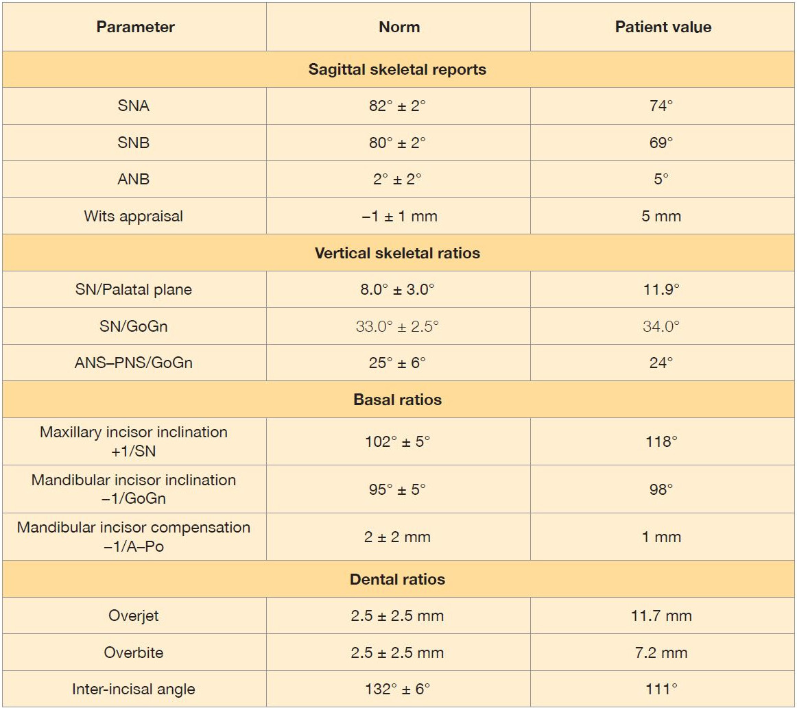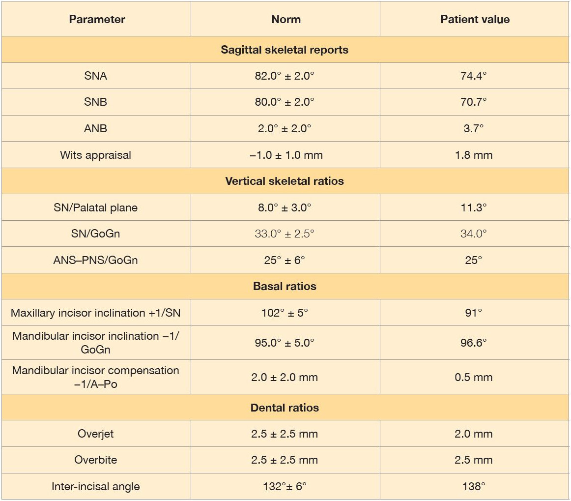 Table 1: Initial cephalometric analysis showing sagittal, vertical, basal and dental measurements compared with reference norms.
