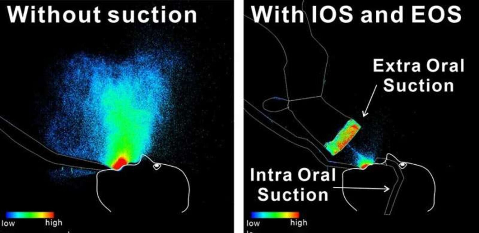 Then, extra-oral suction (EOS) and intra-oral suction (IOS) were used to determine how well these oral suction devices work. Using these techniques, the researchers reduced droplet and aerosol spread within the air by 97.8% when both EOS and IOS were used, and a 92.1% reduction using IOS alone. The researchers published their results in the Journal of Prosthodontic Research.