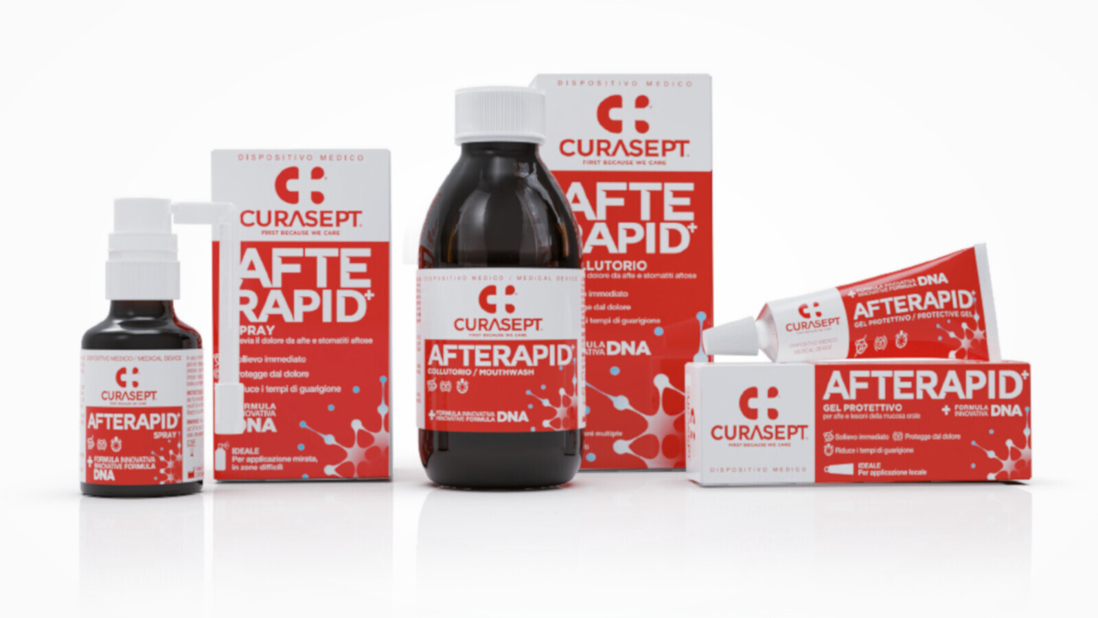 Consisting of a mouthwash, a protective gel and a spray, Curasept Afterapid is a line of oral healthcare products with an innovative formulation that includes exclusive ingredients with protective, anti-inflammatory, anti-oedematous and reparative elements, such as tea tree and manuka oil, 18-beta glycyrrhetinic acid, allantoin and ruscogenin. Biomoist hyaluronic acid plays a pivotal role in mitigating inflammation and fostering the repair and protection of gingival and mucosal cells. Furthermore, the formula incorporates plant-derived DNA and RNA fractions, renowned for their anti-inflammatory properties, capable of activating biological mechanisms conducive to tissue repair.
